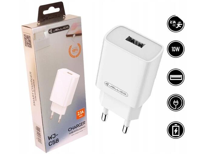 Hálózati töltő egy USB porttal, Jellico WJ-C58 92399, 5V, 2.1A, fehér